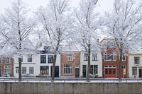 Typisch Nederlandse oude huizen aan de Burgel gracht in Kampen met berijpte bomen in de voorgrond. De Burgel gracht loopt dwars door het oude stadscentrum van de oude Hanzestad Kampen aan de IJssel.