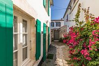 Typisch oud huis met groene luiken in een smalle straat van Ars-en-Ré op het Île de Ré, Nouvelle-Aquitaine, Aquitaine, Frankrijk