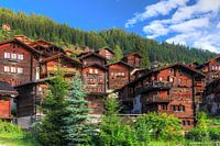 Prachtige opname van het wintersport dorp Grimentz in de Zwitserse Alpen in de Val d'Anniviers vallei in het kanton Wallis in Zwitserland in de zomer met houten chalets en geraniums op het balkon