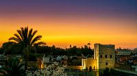 Huizen in Marrakech terwijl de zon langzaam ondergaat. De oosterse warme dag verandert in een zwoele nacht.