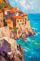 In levendige kleuren vertelt het landschap het verhaal van een pittoresk kustdorpje dat zich dramatisch tegen de kliffen nestelt. De warme terracotta daken steken fel af tegen het diepblauwe water, terwijl de zachte golven ritmisch tegen de kliffen slaan. Hier heerst rust, omringd door de majestueuze kracht van de natuur en de…