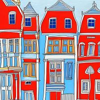 Kleurige printen, abstract, figuratieve illustraties met afbeeldingen van huizen, grachtenpanden uit diverse landen en steden.