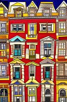 Kleurige printen, abstract, figuratieve illustraties met afbeeldingen van huizen, grachtenpanden uit diverse landen en steden.