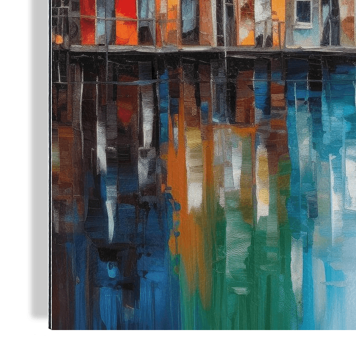 Uitzicht over een gracht in Amsterdam in de stijl van een modern schilderij.