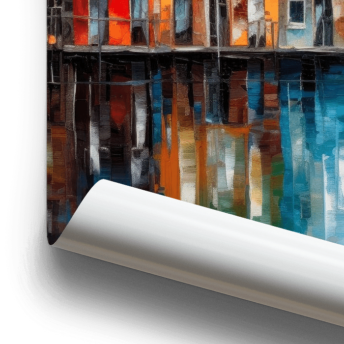 Uitzicht over een gracht in Amsterdam in de stijl van een modern schilderij.