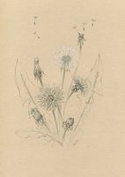 Op okerkleurig papier is een paardenbloemplant afgebeeld met knoppen, bloeiende bloemen, bladeren en paardenbloemen. Een paar parachutes met zaadjes gaan net de lucht in.