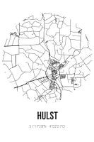 Zwart-witte landkaart, stratenplan of plattegrond van Hulst. Hulst is gelegen in de gemeente Hulst, provincie Zeeland. Op de stadskaart zijn alle openbare wegen in Hulst opgenomen. Verder is de kaart voorzien van de coördinaten van het centrum van Hulst.