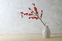 Hulst of ilex tak met rode bessen versierd met een witte kerstbal in een kleine vaas tegen een gepleisterde muur, minimalisme, eenvoudig maar doeltreffend winterarrangement, kopieerruimte