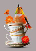 In dit unieke stilleven komt een betoverend tafereel tot leven: een levendige kolibrie in schitterende zalmroze/ oranje tinten rust sierlijk op een stapel klassieke porseleinen kopjes met gouden accenten.