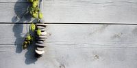 Humulus lupulus, Hop, Stenen. Hop is lekker in bier, maar ook zeer decoratief, zoals je ziet tegen een paar mooie houten planken.