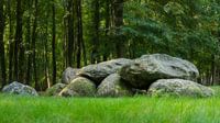 Hunebed D7 in Drenthe (NL) gelegen in het bos met fris groen gras op een zonnige dag, zonlicht door de bomen valt subtiel op de stenen van het hunebed
