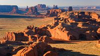 Een zonsondergang met het uitzicht vanaf Hunts Mesa in Monument Valley, in de Navajo Nation op de grens van Utah en Arizona in het Amerikaanse zuidwesten.