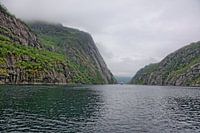 Das große Hurtigrutenschiff wirkt winzig im Vergleich zu den hohen Bergwänden im Trollfjord. Als Tourististenattraktion machen die Schiffe immer einen kleinen Abstecher in den engen Fjord. Vesterålen, Nordland, Norwegen. Juli 2016