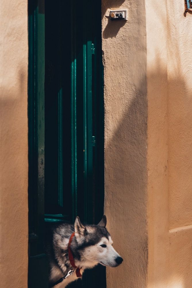 Husky in de zon van een deuropening in het stadje Mdina op het eiland Malta