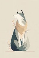 Een minimalistische illustratie van een rustige Husky in zachte, natuurlijke tinten. Het dier, gehuld in een beige sjaal, straalt sereniteit uit met zijn gesloten ogen en opgeheven snuit. De compositie wordt verrijkt door subtiele botanische elementen en een uitgekiend kleurenpalet van grijstinten en warme aardetonen.