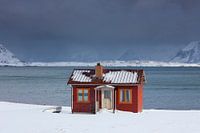 Eenzame hut bij de fjord in de sneeuw, Lofoten, Noorwegen