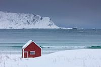 Eenzame hut bij de fjord in de sneeuw, Lofoten, Noorwegen