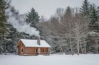 Een charmante blokhut troont midden in een besneeuwd winterlandschap en de rook stijgt zachtjes op uit de schoorsteen. De omringende besneeuwde bomen geven dit idyllische plaatje een vredige sfeer. Ideaal voor in de woonkamer, het straalt warmte uit en nodigt uit tot dromen - perfect voor gezellige uurtjes bij het vuur.
