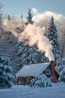 Een schilderachtige winteridylle, waar de rook zachtjes opstijgt uit de schoorsteen en een gezellige sfeer verspreidt. Omringd door besneeuwde dennenbomen straalt het gezellige huisje een uitnodigende charme uit. Het is ideaal voor de woonkamer en creëert een warme, nostalgische sfeer die uitnodigt om te blijven hangen en te dromen.