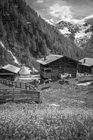 Hutten van de Oberstalleralm (1.870 m) in het achterste Villgratental, uitzicht op de Riesenspitze (2.774 m) (zwart-wit), Oost-Tirol, Tirol, Oostenrijk