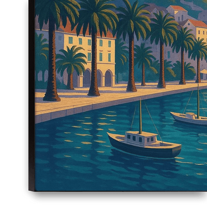 Deze art-decoposter van Hvar geeft de zonovergoten glamour weer van een van de meest geliefde eilanden van Kroatië. Omlijst door elegante palmbomen en de glinsterende haven, toont de compositie de charmante waterkant van Hvar met boten die zachtjes dobberen in turquoise wateren. Uitkijkend over het tafereel gloeit het fort in de gouden…