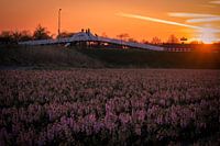 hyacinten bij het tegenlicht van de ondergaande zon. Dit is tussen Alkmaar en HHwaard.Op de achtergrond de kerkbrug en/of De Ambachtsmolen van Oudorp