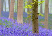 Bloeiende Wilde Hyacinten bloemen in een bos met Beuken bomen tijdens een mooie vroege lente ochtend. Het Hallerbos in de buurt van Brussel in België is in de lente een bekende plaats voor wilde hyacinten.