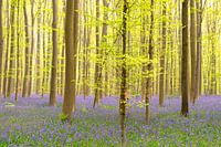 Beukenboom met frisgroene bladeren in een Hyacintenbos tijdens de lente in het Hallerbos in de buurt van Brussel in België tijdens een mooie lentedag. De bosbodem is bedekt met bloeiende blauwe Hyacinten bloemen (Hyacinthoides non-scripta).