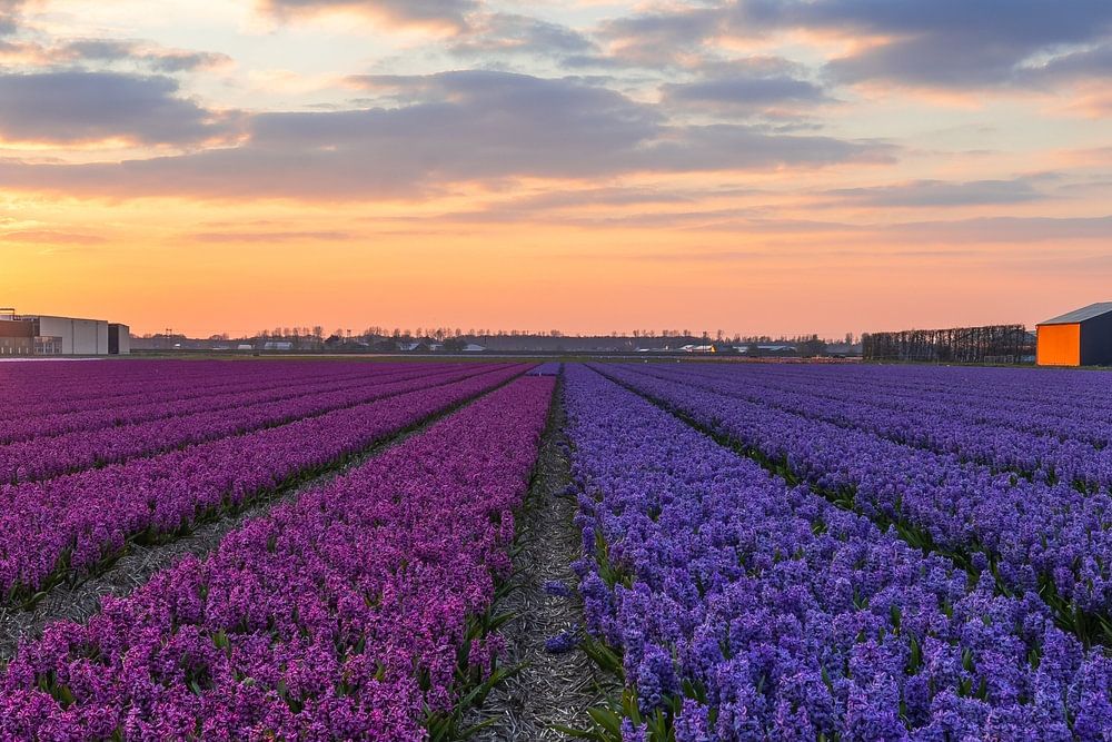 Deze adembenemende foto vangt de betovering van een hyacintenveld in de bollenstreek, nabij Keukenhof, tijdens een prachtige zonsondergang. Het veld is bezaaid met een weelderige mix van roze en paarse hyacinten, die zich uitstrekken tot aan de horizon en een kleurenpracht vormen die de zintuigen betovert.