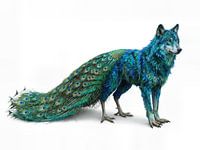 Hybride wezen: wolvenkop, romp en poten; pauwenkleed op rug en staart. Vacht weergegeven in turquoise en blauwe tinten. Witte achtergrond.