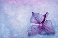 Macro van een Hydrangea bloemblaadje, bewerkt met texturen voor een schilderachtig effect en afgezwakt in blauw en violet tinten