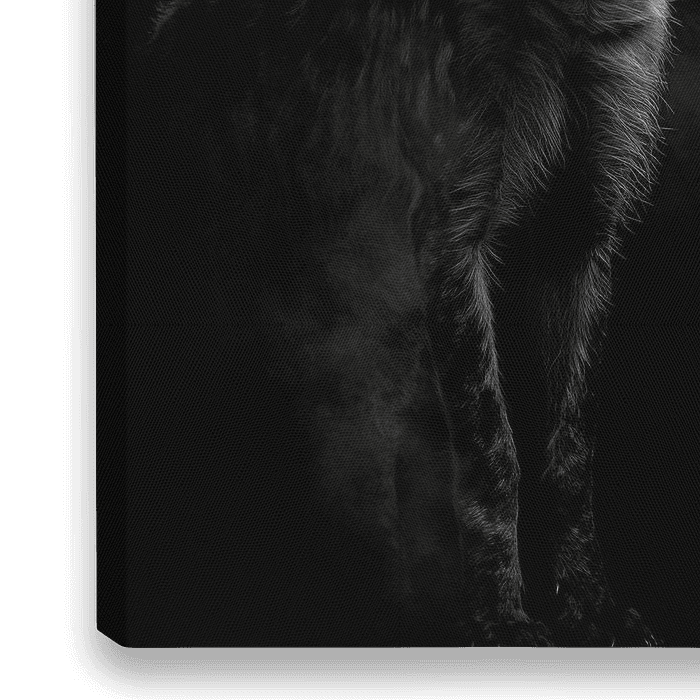 In mysterieus zwart-wit valt het schepsel op met zijn doordringende blik en indrukwekkende aura van wildheid. De fijne details van een gevlekte vacht en de kenmerkende oren geven dit beeld een betoverende aanwezigheid. Perfect voor een woonkamer, waar het een gesprek kan stimuleren en een vleugje avontuur aan de sfeer kan toevoegen.