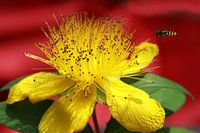 Deze prachtige gele bloem Hypericum Beanii behoort tot de vaste planten. Nieuwsgierig en door de bloem nectar gelokt komt deze zweefvlieg net op de goede moment aanvliegen. Wat een geluk, en een mooi extraatje, zo is mijn plaatje helemaal compleet.
