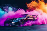 'Hyperkleur Drift' vormt samen met ''Snelheid Rook Supercar' een panoramisch tweeluik. Hier drift de auto dwars door roze en oranje rook, breed in beeld alsof je zelf langs de baan staat. Het moment werd geïnspireerd tijdens de zogenaamde “golden hour” op het circuit, toen de ondergaande zon de dampen in tropische tinten kleurde. Ik…