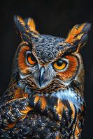 Deze adembenemende afbeelding van een uil, getekend in een hyperrealistische stijl, springt onmiddellijk in het oog dankzij zijn levendige kleuren en indrukwekkende detailniveau. Het portret, waarin de majestueuze uil frontaal is afgebeeld, toont de intense oranje ogen die scherp en doordringend zijn. De veren van de uil zijn kunstig weergegeven met rijke tinten oranje, zwart, bruin en wit, waardoor een textuur ontstaat die bijna tastbaar lijkt. Dit stuk zou een opvallende aanwinst zijn voor elke moderne woonkamer of kantoor, perfect voor diegenen die natuur en kunst waarderen.