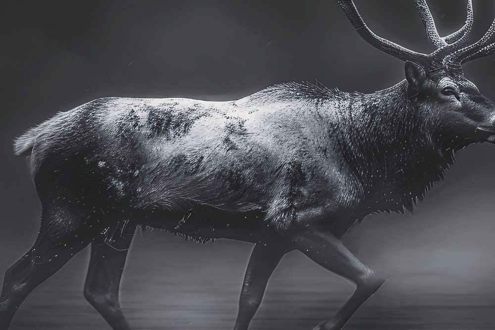 Dit indrukwekkende zwart-wit ontwerp toont een majestueus hert dat door het water waadt. Het hyperrealistische detail benadrukt de kracht en de gratie van dit prachtige dier. De monochrome kleurstelling geeft een dramatisch effect dat de aandacht trekt en perfect past in een moderne of minimalistische inrichting. Dit kunstwerk is een uitstekende keuze voor natuurliefhebbers en biedt een serene en elegante uitstraling aan elke ruimte. Plaats het in een slaapkamer of kantoor om een gevoel van rust en verbinding met de natuur te creëren.