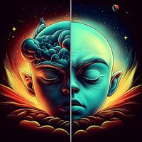 De ene helft van het gezicht bloeit met kosmische…