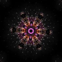 Dit hypnotiserende en complex abstracte kunstwerk is opgebouwd als een caleidoscoop, met een perfecte radiale symmetrie rondom een centrale, gloeiende kern. De compositie is gecreëerd uit fragmenten van een donkere, paarse en oranje bloem (waarschijnlijk een distel), die in een perfect geometrisch patroon zijn gerangschikt. Tegen de diepzwarte achtergrond lijkt de structuur te pulseren, wat een gevoel van kosmische energie en diepte creëert. De kleine, losse zaadpluimpjes rond de centrale vorm versterken het gevoel van een uitdijend, geordend universum.
