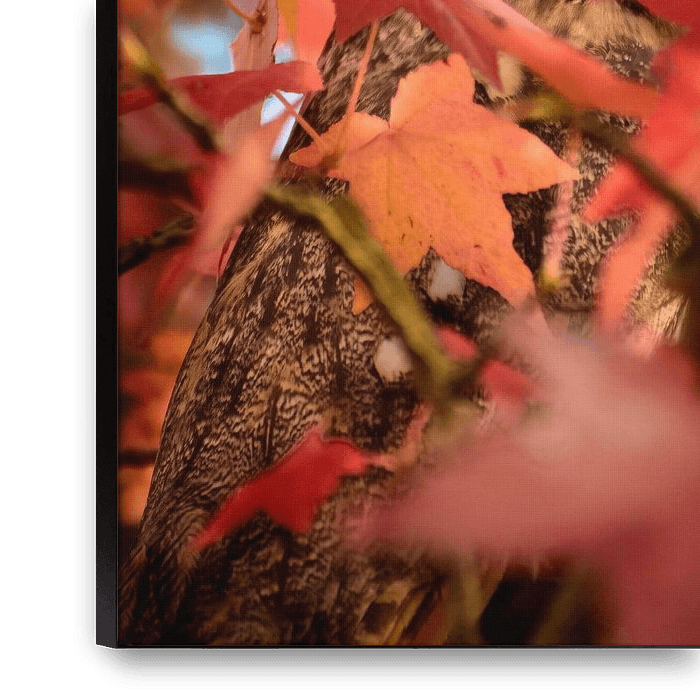 Wat een prachtige oranje ogen heeft de ransuil toch. Het kleurt erg goed met de herfstkleuren van de bladeren.