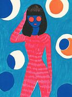 Een hypnotiserend en futuristisch kunstwerk dat speelt met kleurcontrasten en vormen. De mysterieuze vrouwelijke figuur, met een diepblauwe huid en felrode zonnebril, straalt een surrealistische en avant-gardistische vibe uit. De abstracte achtergrondelementen en het gebruik van levendige kleuren zoals elektrisch blauw, koraalrood en oranje geven het werk een dynamisch en modern karakter. Dit kunstwerk is perfect voor liefhebbers van retro-futuristische kunst, grafische illustraties en expressieve, gedurfde portretten.