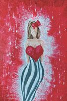 Ik ben liefde. Een vrouw met een groot rood hart zo groot als haar bovenlichaam en een lange grijs wit gestreepte jurk staat met haar heupen wat gebogen verleidelijk naar ons te kijken.