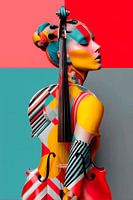 Een artistiek kunstwerk van een vrouw met haar viool in een opvallende pose, zij is geschilderd in een levendige abstracte stijl met opvallende geometrische patronen en een palet van felle kleuren. Haar lichaam is geïntegreerd en gaat naadloos over in haar viool. De algehele compositie geeft een gevoel van harmonie tussen de vrouw en…