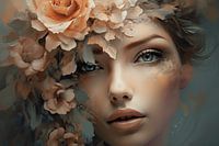 Digital art portret, close-up. "I can see your soul". Een bijzonder portret van een jonge vrouw met heldere, sprekende ogen en bloemen om haar heen in pastelkleuren. Modern chic.