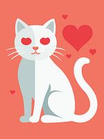 Minimalistisch werk van een witte kat met hartjes en een zacht oranje rode achtergrond.