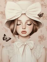 I'm a Dreamer. Illustratie van een meisje met grote hoed in neutrale tinten. Ze staat voor een roze achtergrond en om haar heen vliegen twee vlinders. Een bijzondere blikvanger voor je interieur!