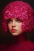 Een surrealistisch portret van een jonge vrouw met een hoofd vol felroze bloemblaadjes. Haar blik is rustig en dromerig, wat mooi contrasteert met de intense kleur en textuur. Het voelt zacht en krachtig tegelijk.
