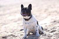 Vrolijke zwart witte Franse Bulldog op het strand.