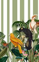 Een "Summer full Colour", deze collage van vintage afbeeldingen van papegaaien en kaketoes en van tropische planten en bloemen, op een groen gestreepte achtergrond.