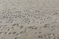 Voetstappen in het zand van het strand van Egmond aan Zee. Sporen van wandelaars. Wandelen langs het strand. Veel mensen laten sporen achter. Op het strand aan de kust langs de Noordzee.