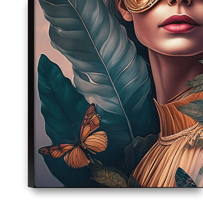 Een kleurrijk protret van een geblinddoekte vrouw, Versierd met tropische bladeren, pioenrozen en droogbloemen. Dit werk heeft een zachter romantische uitstraling, maar benadrukt de schoonheind en vooral de kracht van elke vrouw. Soms hebben we de behoefte om even in ons zelf te keren en te dromen van een prachtige omgeving. Vol mooie…